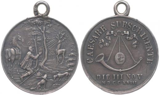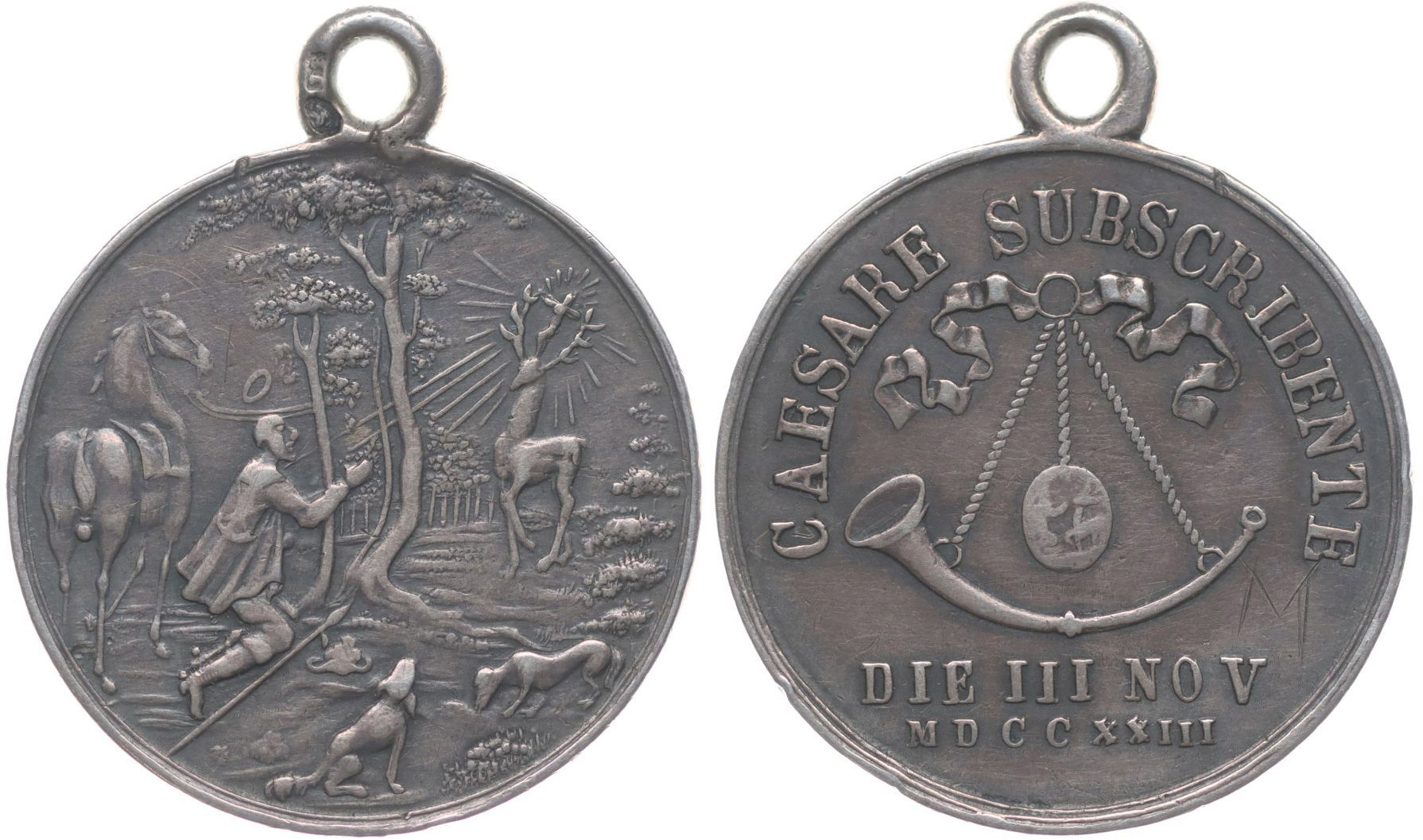 Stříbrná lovecká medaile, DIE III NOV MDCCXXI1I (1723), vidění sv.Huberta / na stuze zavěšená lovecká trubka, opis CAESARE SUBSCRIBENTE, ražen na paměť zápisu císaře Karla VI. do pamětní knihy Řádu sv.Huberta, Nesign., 2x punc. na oušku, Ag 28 mm, 8,62 g, Don.3924_orig.raž.ouško se dvěma puncy RR!