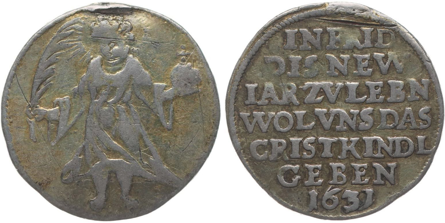 Početní fenik (vánoční) 1631, Ježíšek (Christkind) v celé postavě čelně / 7řádk.nápis, Ag 24,5 mm, 3,67 g, Pol.79pod., Do.4430pod. (oba let.1635)_st. po o. RRR!