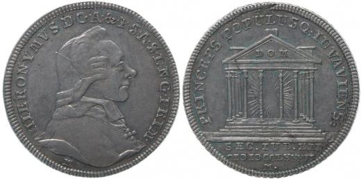 Jeton na 1200.výročí kláštera, 1782 Portrét zprava, opis / pohled na chrám, 3řádk.nápis v úseči, opis Sign.F.Matzenkopf, Ag 25 mm, 3,85 g, Šm.66-D-3, LG.VIII/551
