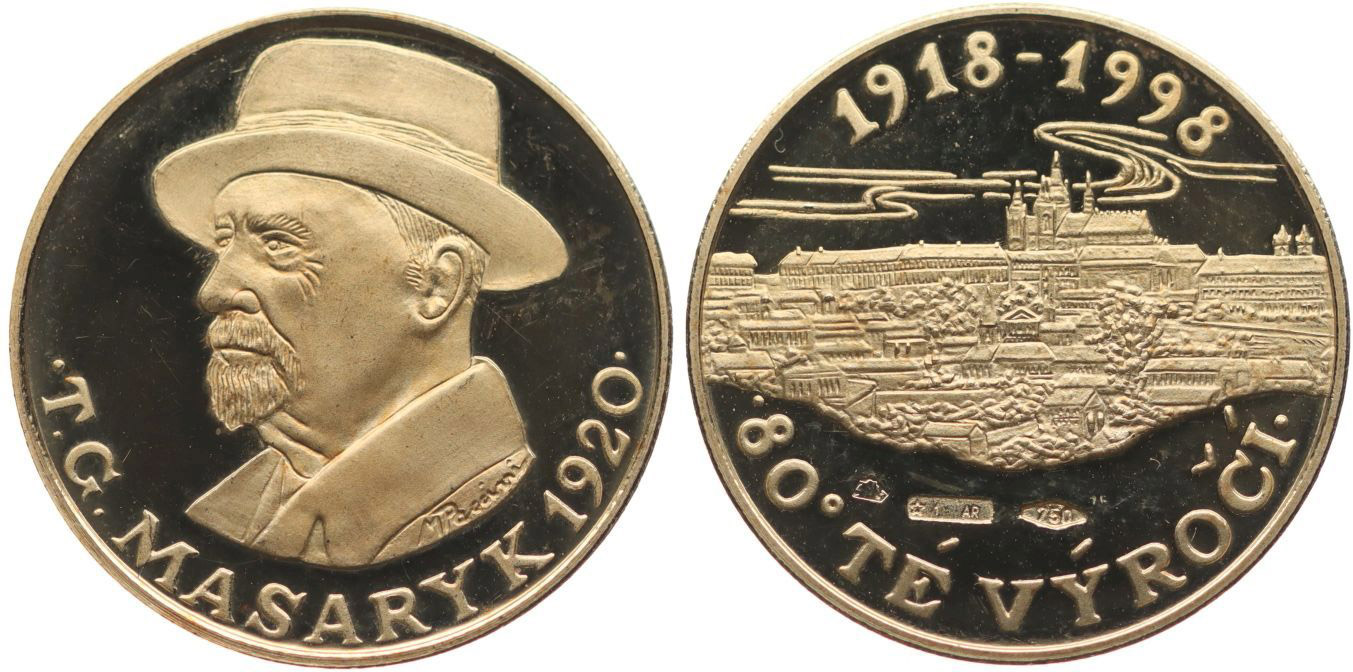 M.Poccini - medaile k 80.výročí obrody českého národa a vzniku republiky 1918-1998, vyd.1999, portrét prezidenta T.G.Masaryka z poloprofilu, opis / panorama Pražského hradu, opis, Sign., Au 750/1000, 21 mm, 6 g, Nov.01.241, raž.697 ks