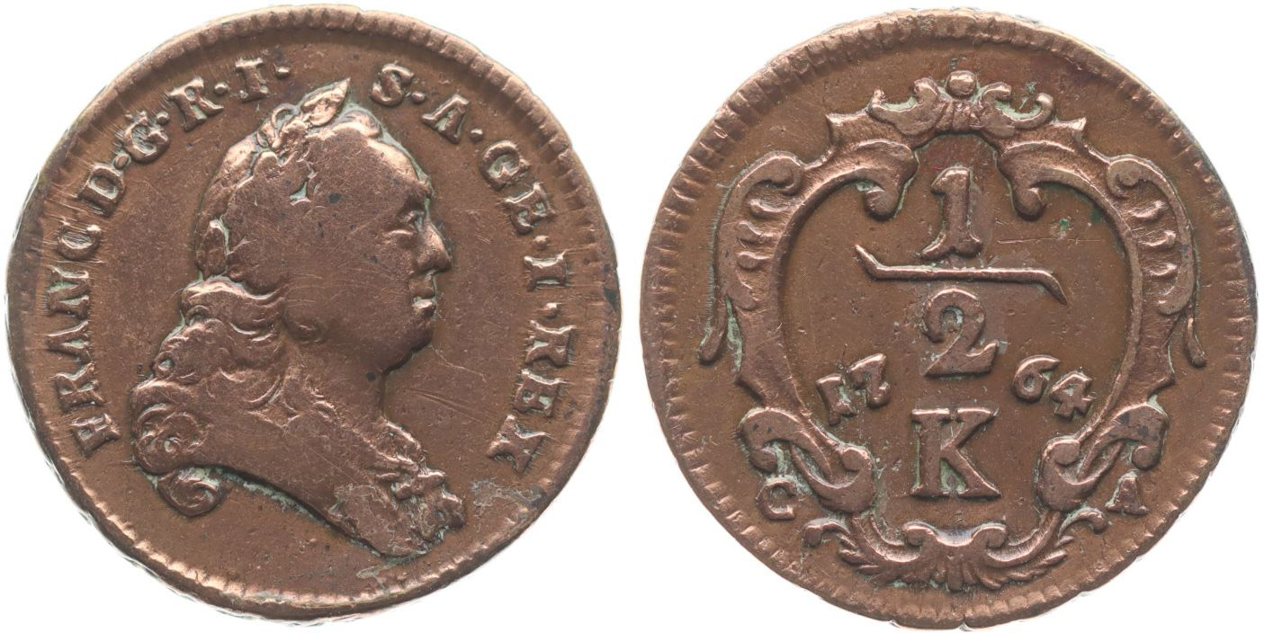 Cu 1/2 Krejcar 1764 C-A, Karlovský Bělehrad, Nový.35, Her.625_R!