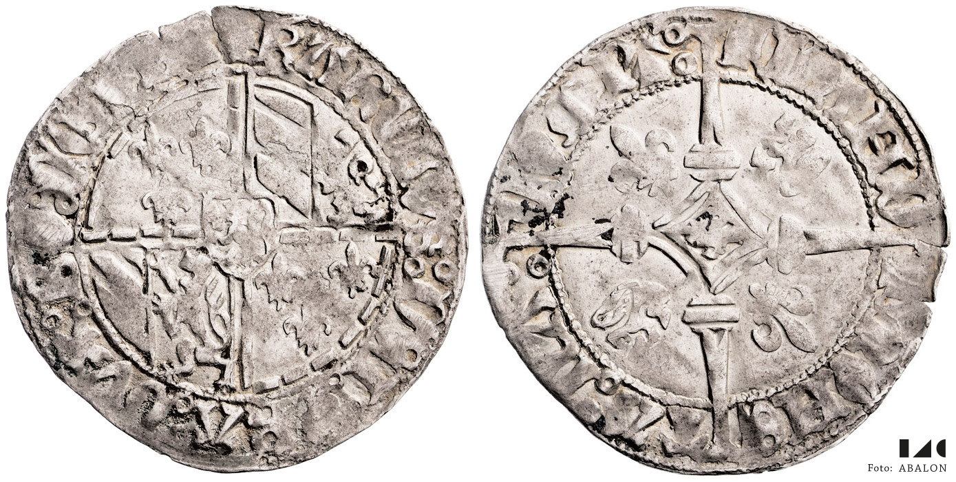 Dvougroš, minc. Bruggy, kříž se znakem, lilie a lev, opis, 28 mm, 2,53 g