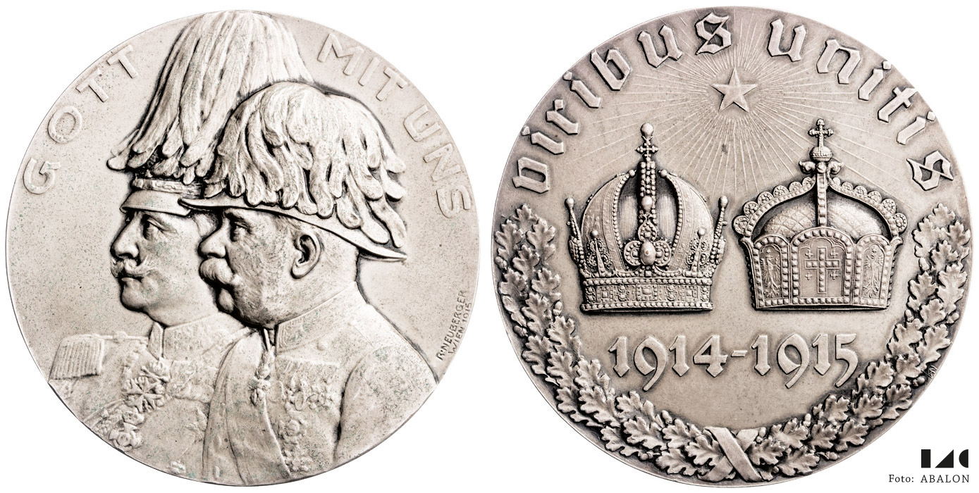 Medaile válečná 1914/1915 "spojenými silami" FJI + Wilhelm II., neusilber 60 mm, sig. Neuberger