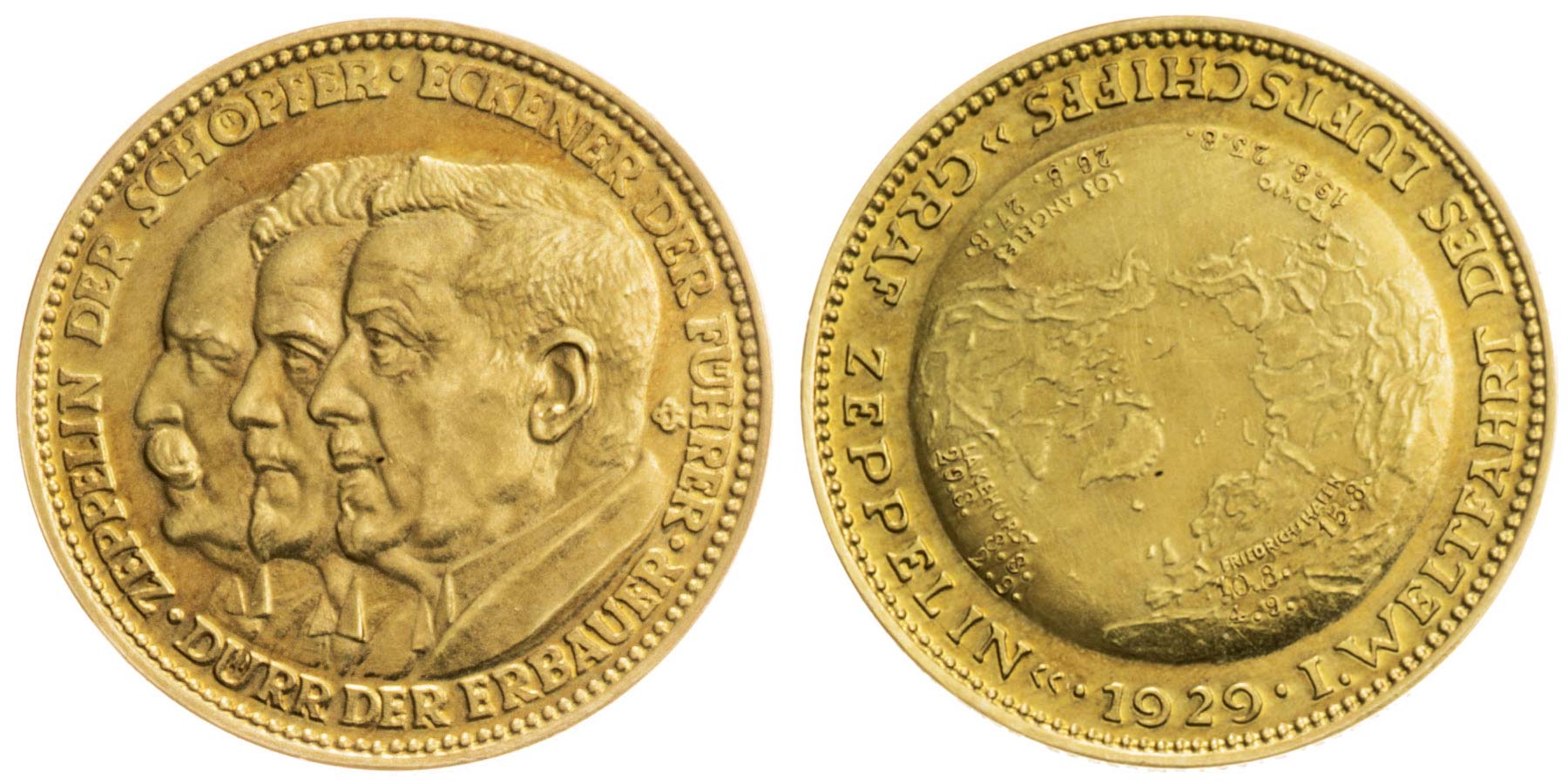 Medaile I. oblet zeměkoule 1929, Zeppelin, Au 22,5 mm, 6,33 g, 750/1000