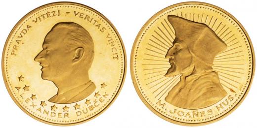 5 dukátová medaile b.l. (1969), 17,48 g, 986/1000, Dubček + Jan Hus, pravda vítězí