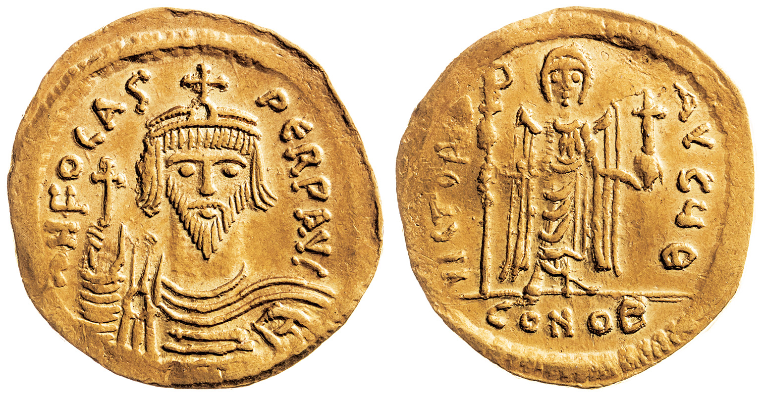 Focas (602-610) Solidus 4,32 g, poprsí čelně, koule s křížem, Victorie drží žezlo s koulí a křížem, Sear 620