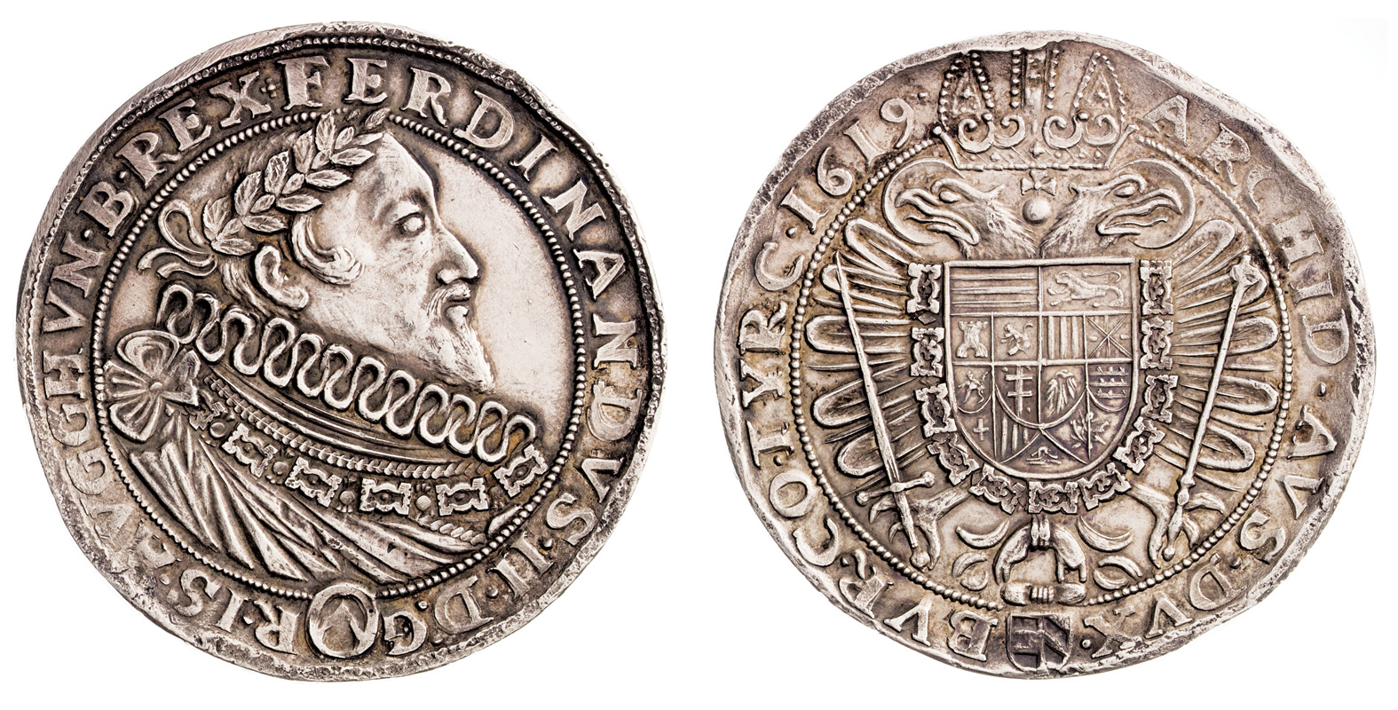 Ferdinand II. (1617-1637) Tolar 1619 Vídeň, nepublikovaný ročník, jako Her. 362, 29,72 g, hrany