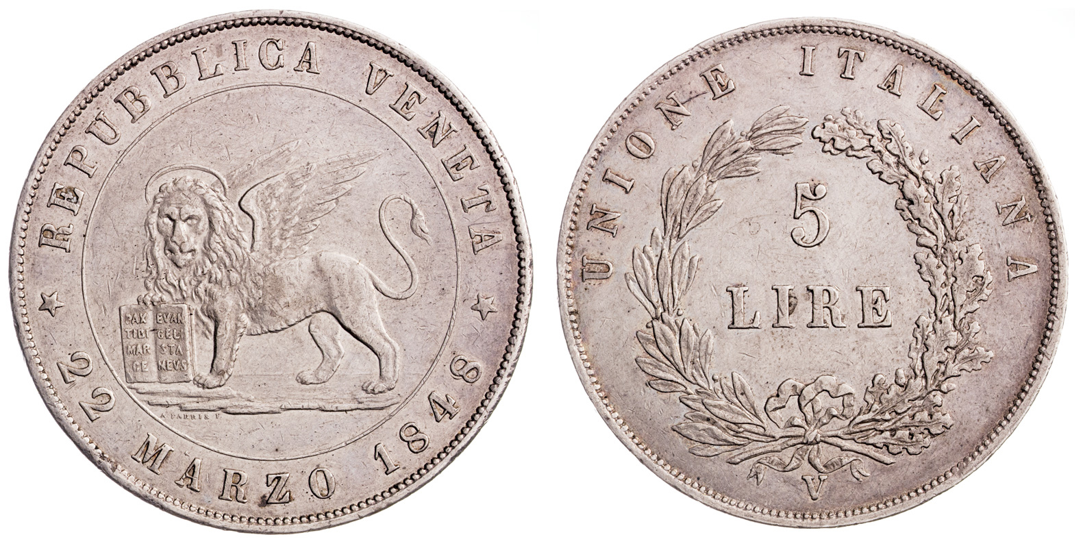Revoluce (1848-1849) 5 lira 1848 V, lev "BENEDITE", bez podstavce, Her. 10