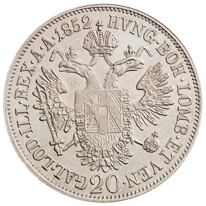 František Josef I. (1848-1916) 20 krejcar 1852 C, Praha, velký, hlava doleva, Franc. Hal. 2060