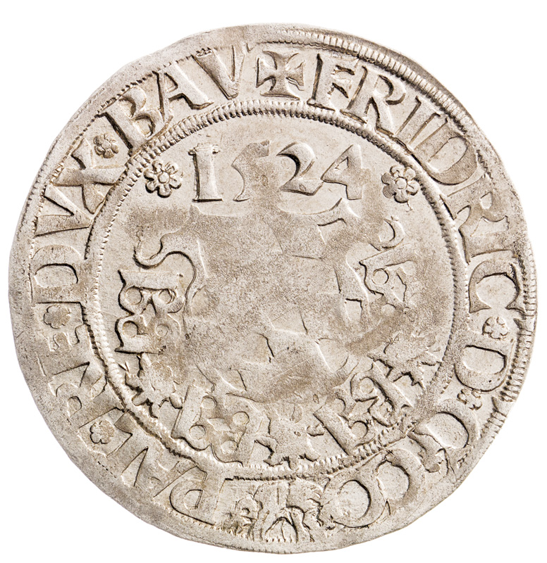 Pfalz Friedrich III., bílý (1508-1556) Batzen 1524, titl. "IOCUM TEMENS"