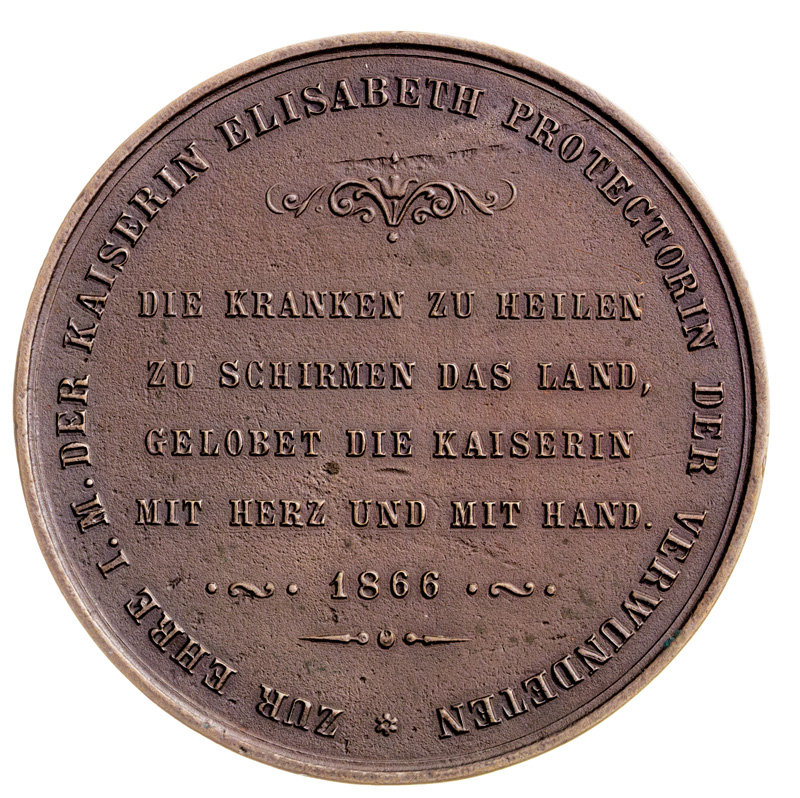 František Josef I. Cu medaile litá 1866 Elizabety, manželky FJI, patronka zraněných, průměr 42 mm, sig. C.KRAUS EDIT a KLEBRERG.FEC.