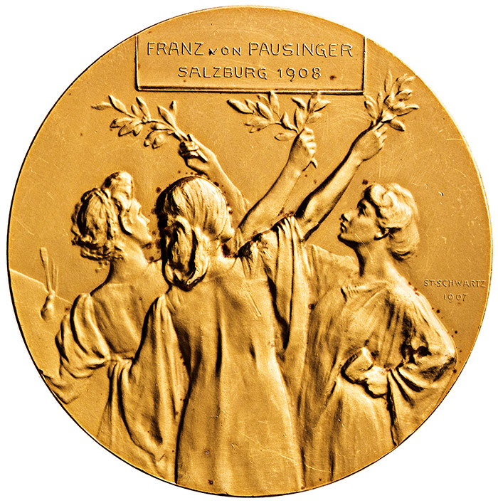 12-ti dukátová medaile - malířské umění, F. PAUSINGER, Salzburg 1908, 42 mm, 41,85 g, sig. Schwartz, punc., n. škr.