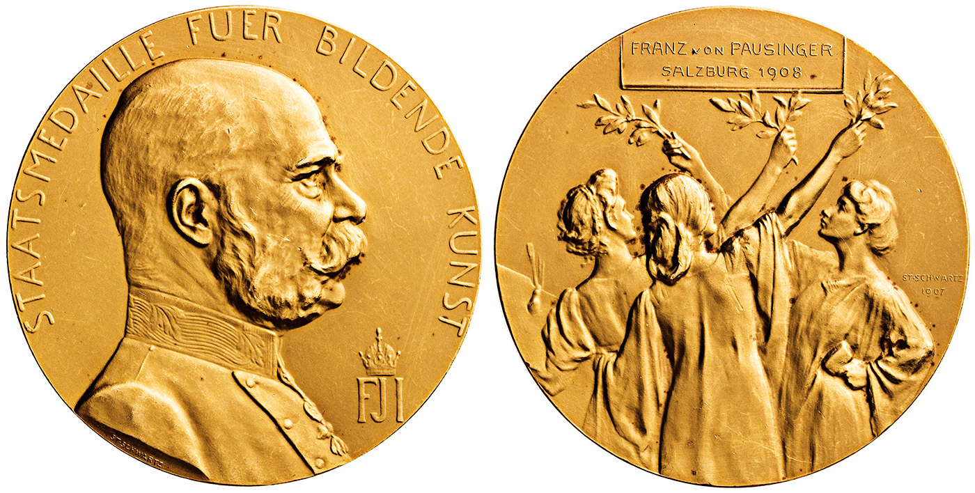 12-ti dukátová medaile - malířské umění, F. PAUSINGER, Salzburg 1908, 42 mm, 41,85 g, sig. Schwartz, punc., n. škr.