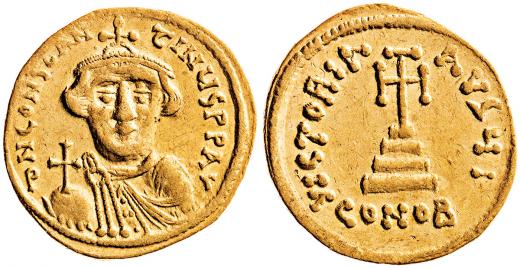 Solidus 4,37 g, Poprsí čelně drží kouli s křížem, kříž na 3 stupních, CONOB, Sear 938