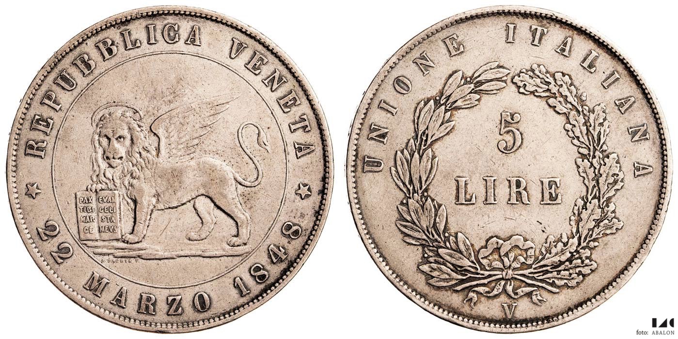 Revoluce (1848-1849) 5 lira 1848 V, lev bez podstavce, Her. 10, 24,83 g