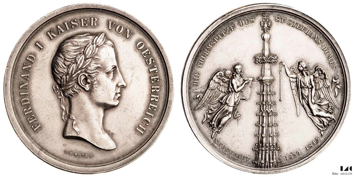 Ferdinand V. Medaile na dokončení věže chrámu sv. Štěpána ve Vídni 1843, Ag 47 mm, 52,47 g, sig. Roth, dr.hr.