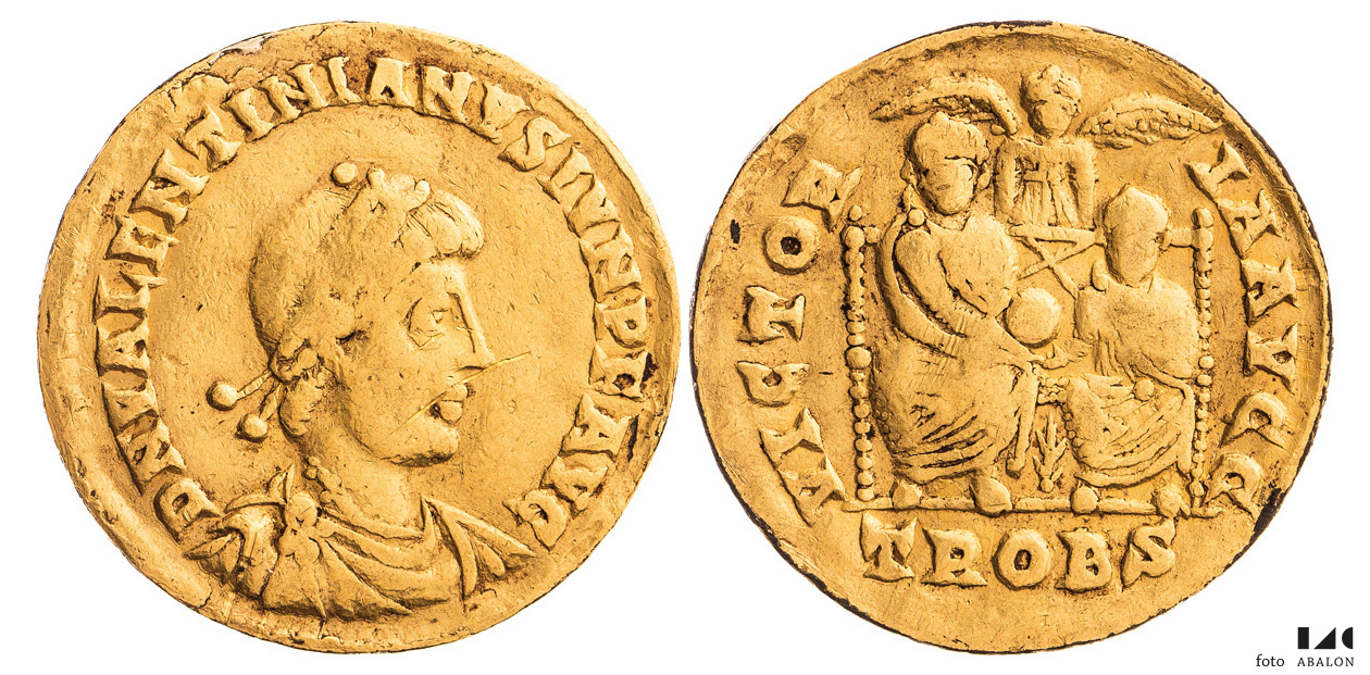 Valentinianus II. (375-392) Solidus, 4,11 g, RIC 49c, Trier, busta s perlovým diadémem, dva císaři na trůnu s globusem, n.hr.