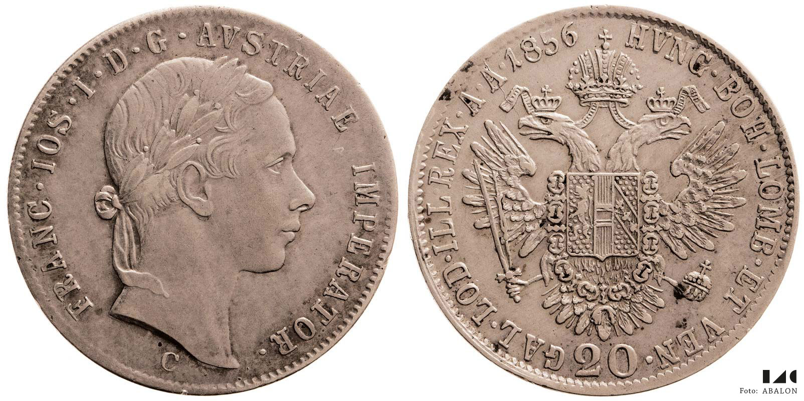 František Josef I. (1848-1916) 20 krejcar 1856 C, Praha, poslední česká vládní mince, Hal. 2061
