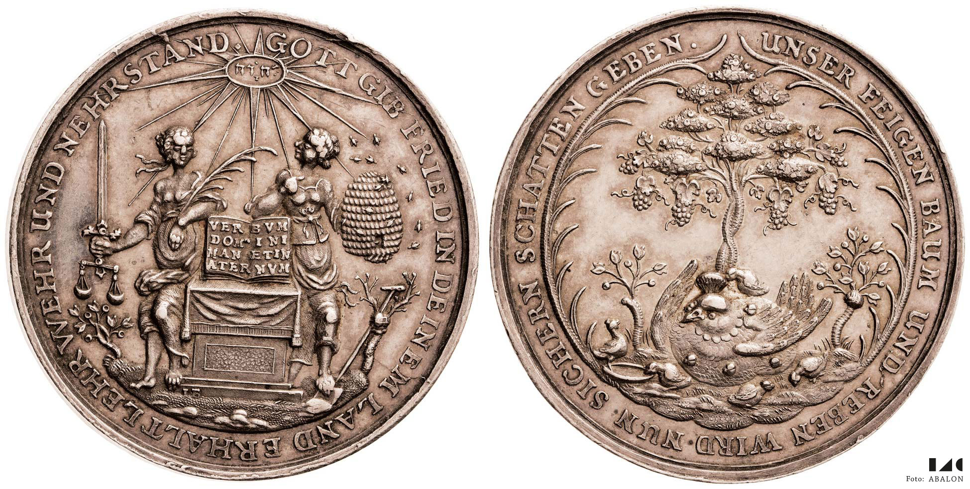 Vratislav - Johann Beusheim (1624-1683) Medaile - Justitir s mečem a Industria se včelím košem, kvočna s kuřaty, vinné keře