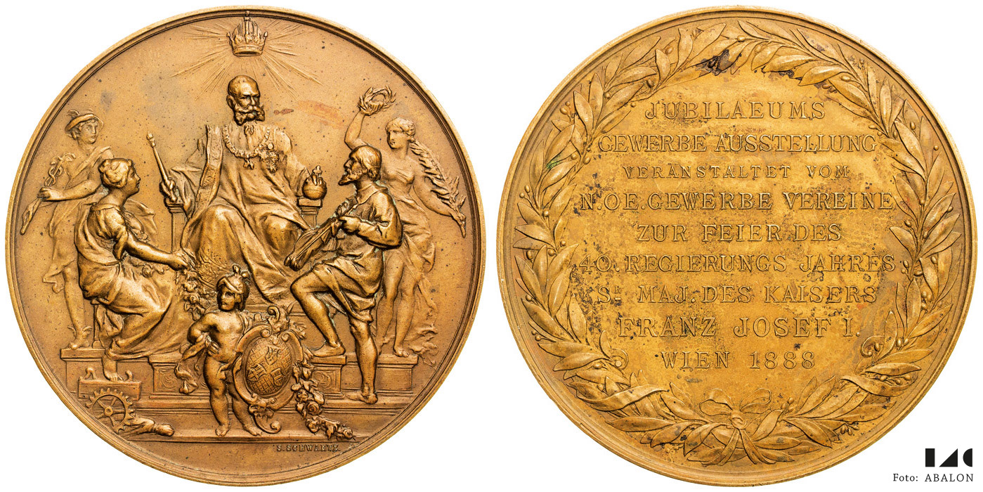 Medaile k výstavám Medaile k hospodářské výstavě a 40 letům vlády 1888 ve Vídni, Br 64 mm, sig. Schwartz