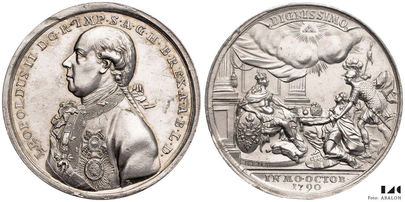 Leopold II. Medaile - korunovace na římského císaře 1790 ve Frankfurtu n/M., Ag 47 mm, 46,27 g, sig. Reich, Nov, XVI. E2a, dr. úhoz na hraně