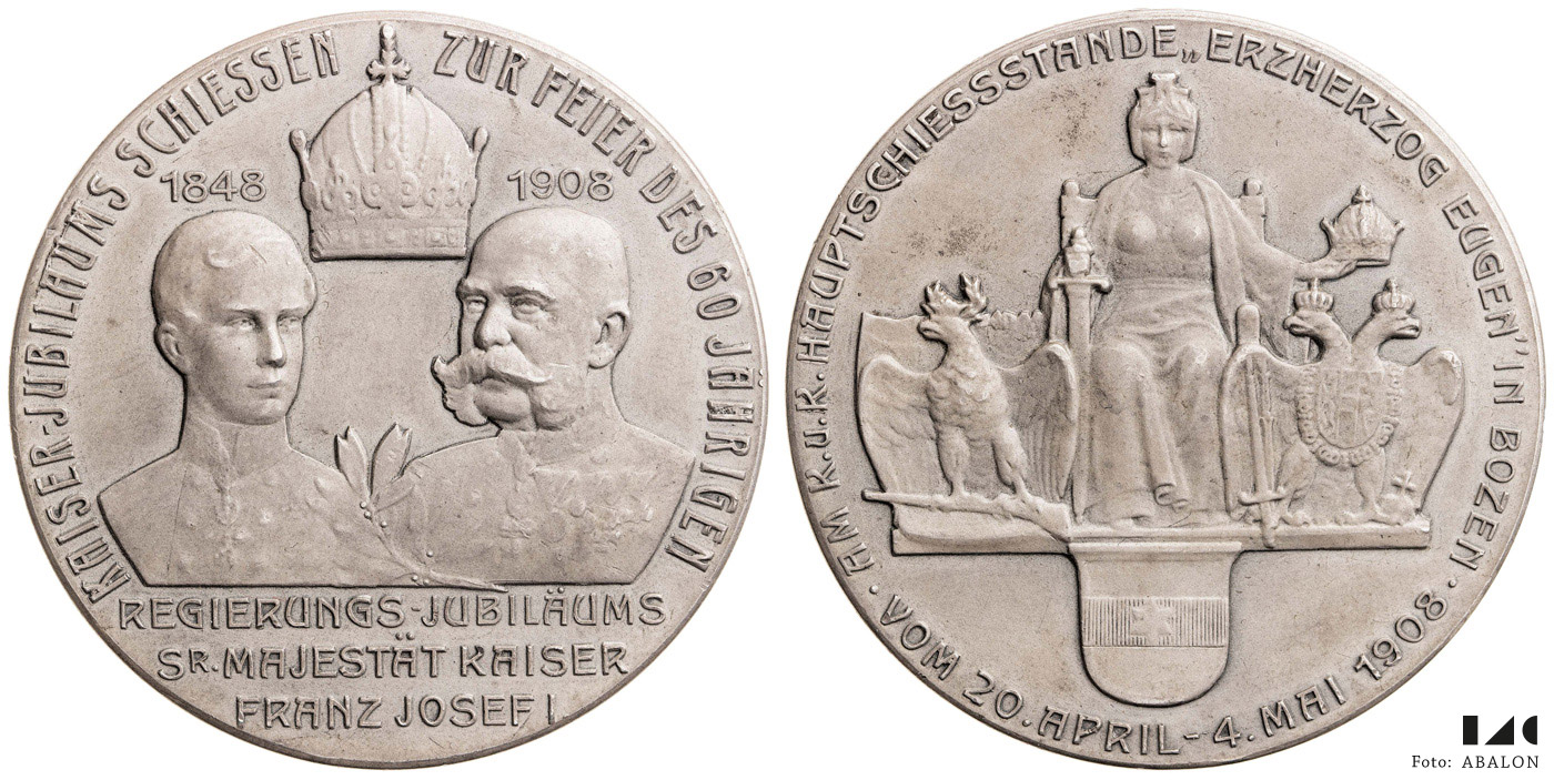 František Josef I. Medaile na císařské jubilejní střelby k 60. výročí vlády 1908 v Bolzanu, Ag 42 mm, 33,05 g