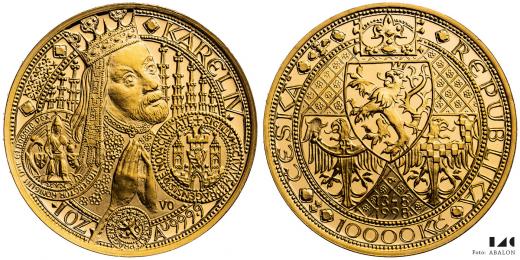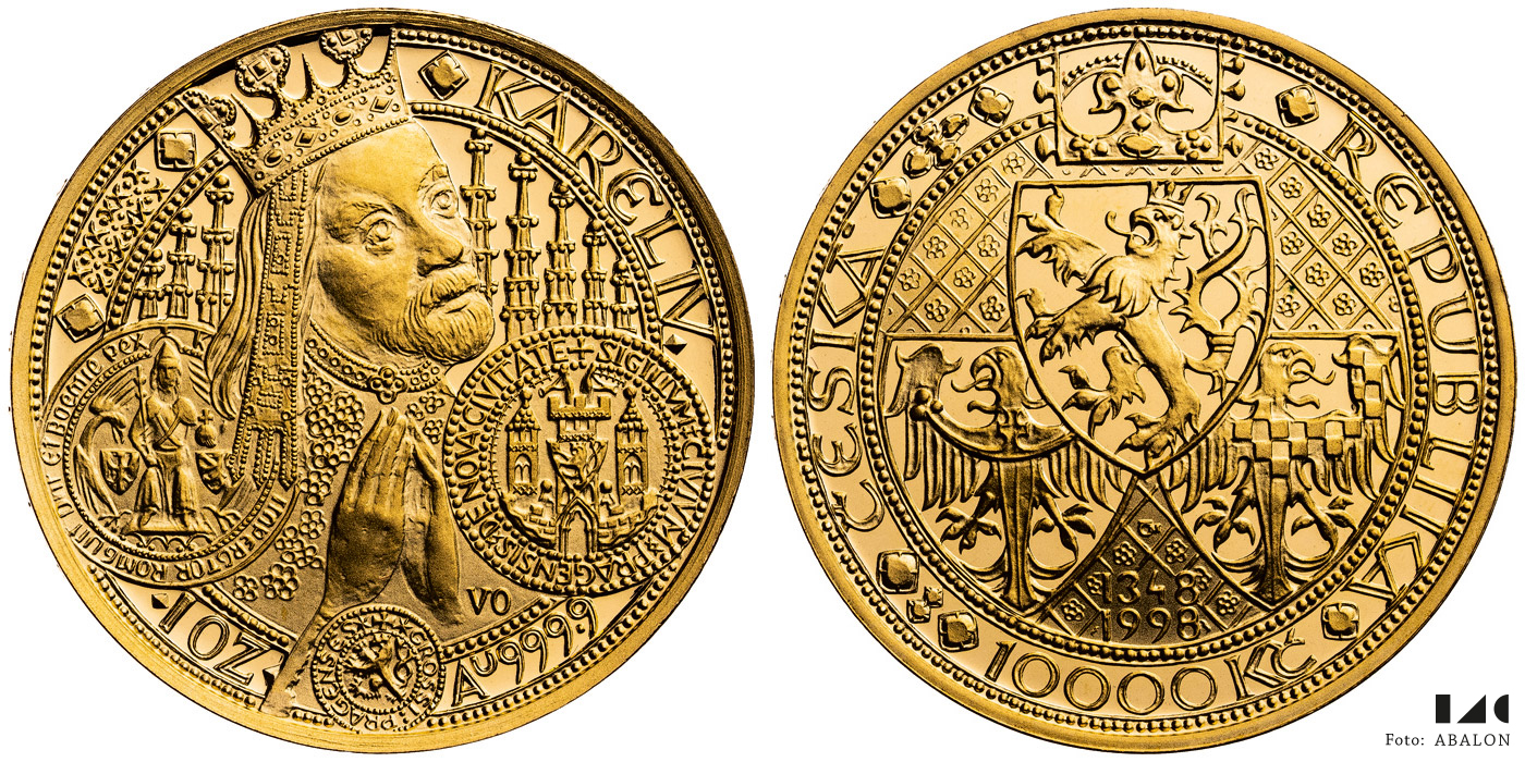 10 000 Kč 1998, Karel IV., raženo1 996 ks, vyhodnocena jako nejkrásnější mince, etue, karta pro rok 1999