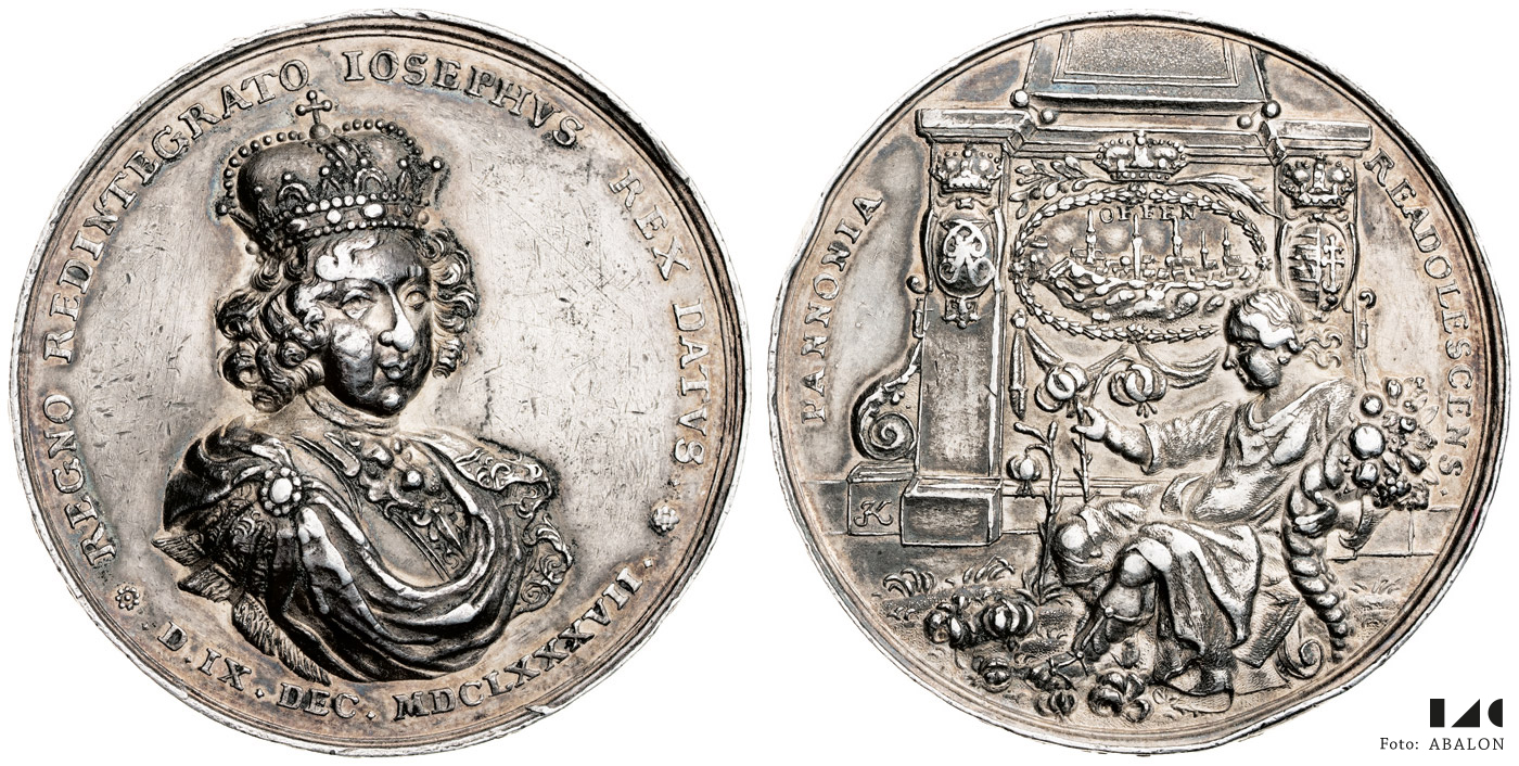 Medaile na korunovaci uherského krále 1687 v Bratislavě, Ag 50,5 mm, 47,80 g, Nov. X A 3b, dr. hr.