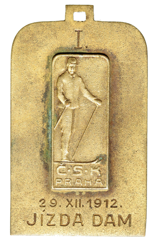 Č.S.K. Praha, I. cena lyžování, jízda dam, 29.XII.1912, plaketa jednostranná s ouškem, 30x47mm