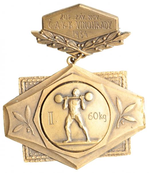 Č.A.K.K. Vinohrady, II. cena vzpírání 60kg župní závody 1934, osmihranná s závěsem