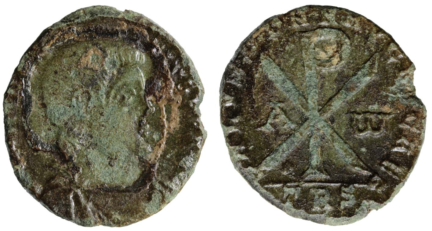 dvou centenionalis poprsí zprava / chí-ró monogram, po stranách alfa-omega, minc. Trevír RIC.318, 6,879g/25,5mm dr.ol.okr, stopy kor.