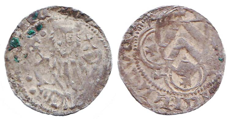 fenik z mincovny Bielefeld, ražen hrabaty z Ravensbergu při návštěvě císaře r.1377, korunované poprsí císaře /erb, Num.sborník 13/1973-74, tab. VIII, č.12 patina, stopy měděnky R dr.exc.