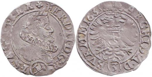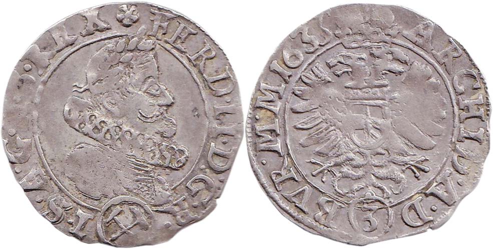 3 krejcar 1633 Kutná Hora-Prunz, MKČ 810/811, značka mincmistra v oválu nep.ned.