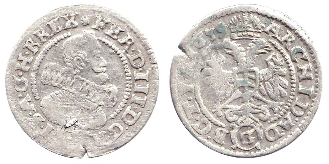 3 krejcar 1639 G Kladsko-Hübner, MKČ 1337 mírně napr.okr, dr.ned.