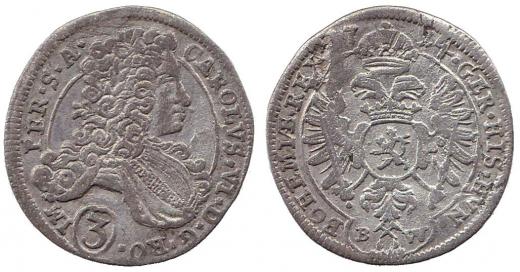 3 krejcar 1714 Kutná Hora - Wohnsiedler, MKČ 1866 dr.škr., nep.vady kovu