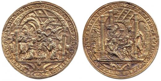 Jáchymov-Nikl Milicz, AR medaile zlacená litá, 48mm, klanění pastýřů, opis/klanění tří králů, opis, Katz-407