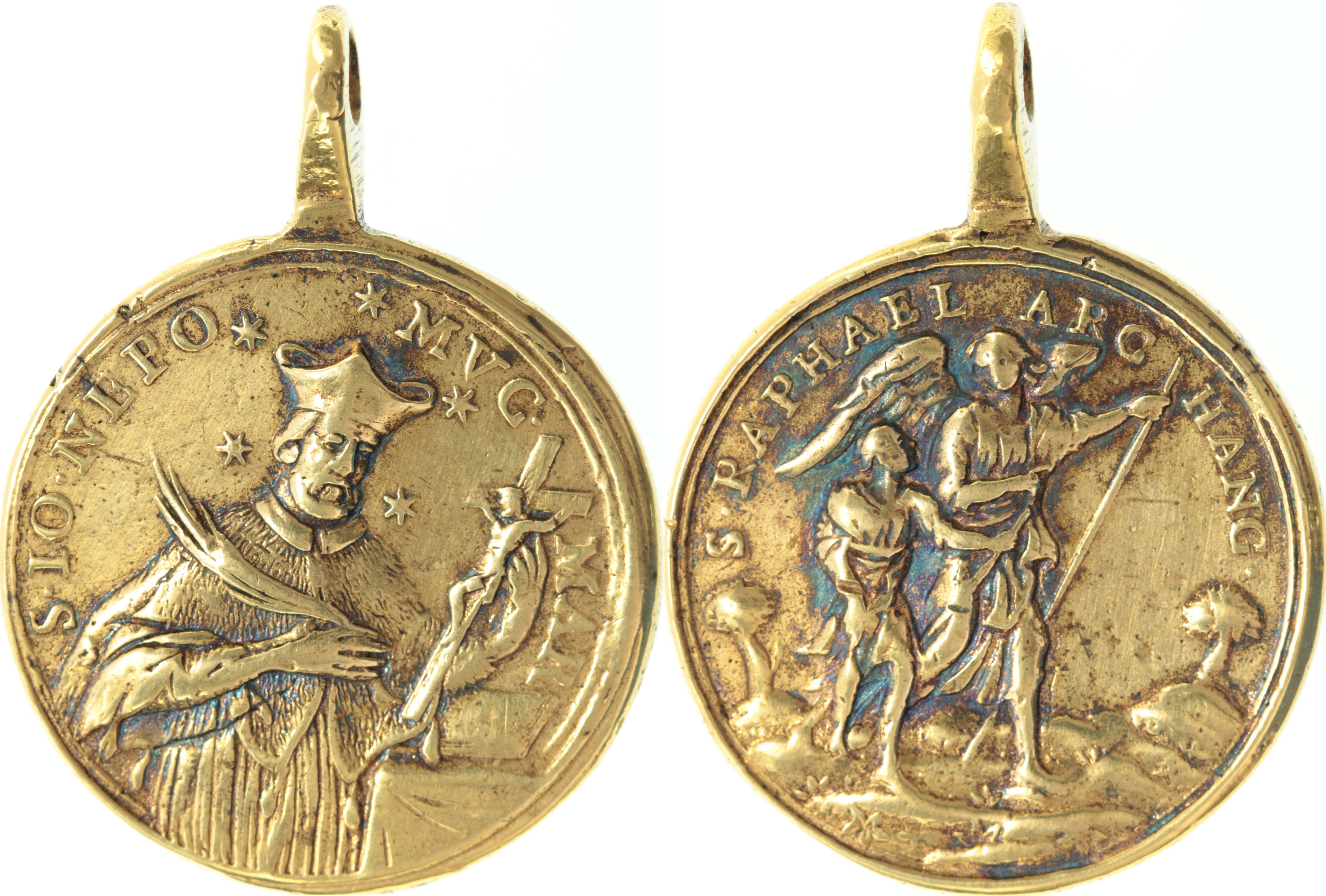 Medaile bronz zlacený, Jan Nepomucký/archanděl Rafael s mladým Tobiášem