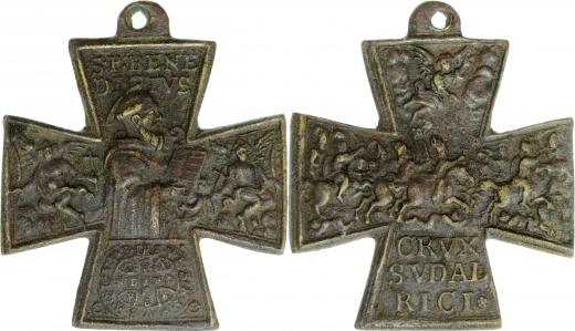 Benediktíni, kříž sv.Oldřicha, S:P:BENEDICTVS, světec s knihou, po stranách andělé/CRVX.S.VDALRICI, bitva na Lechu, 33x32mm/11,065g, krásný exemplář