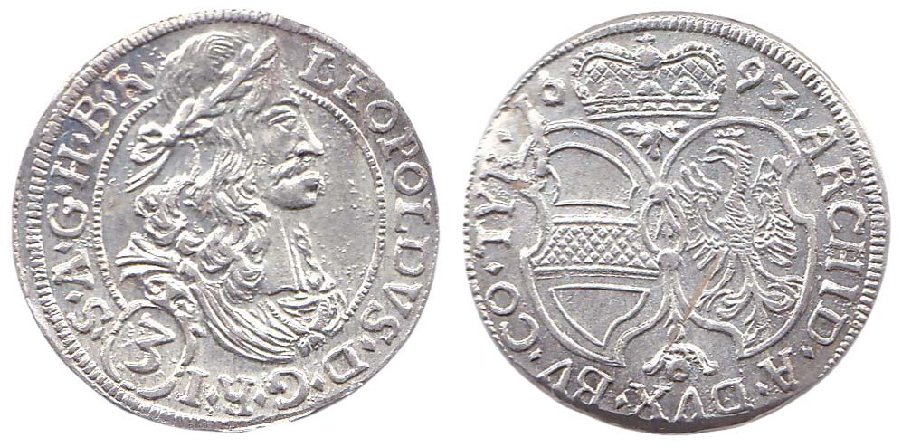 3 krejcar 1693 b.zn. Hall, Nech.2457, Her.1439