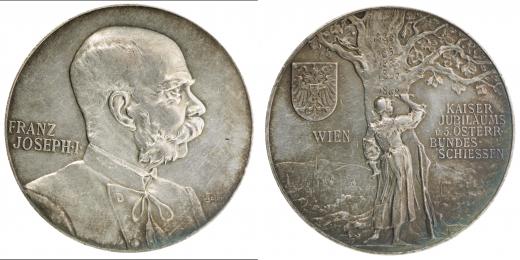 Scharff A., jubilejní V.spolkové střelby ve Vídni 1898 - poprsí zprava, nápis / žena vyrývá vročení do stromu, znak, nápis, Ag 37mm, 24.90g, patina