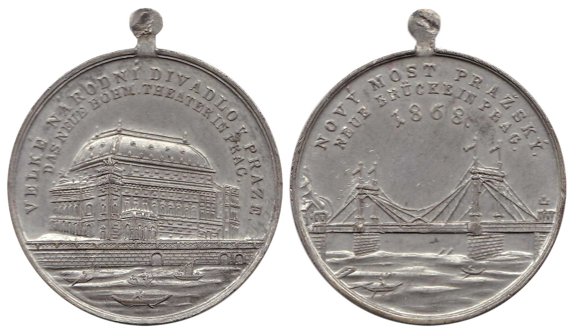 Praha, Nový most pražský 1868/Velké Národní divadlo v Praze, Sn 40mm původní ouško, av: pohled na tehdejší visutý most Františka Josefa I., rv: pohled na Národní divadlo od Vltavy R