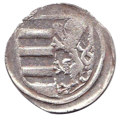 peníz s uhersko-českým znakem, mincovna České Budějovice, Castelin 74a, vysoký štíhlý lev s dlouhými "žabími" prsty, v levé polovině erbu nahoře nad břevnem mezera, Militký 2002, 13 (5b), 0,471g, mírně nedor. R