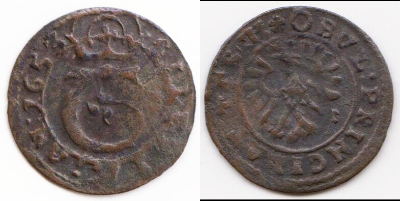 obol 1653, oblouk písmene T zakončen trojlistem, Kopicki 5665, Kaleta VIII 2b var. OBVL:PRINCIPAT:TESCH