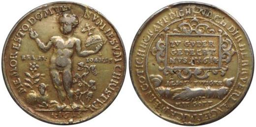 Norimberk ? Ag medaile 1615 litá zlacená, hoch držící říšské jablko, MEMO ESTO DOMINNVM IESVM CHRISTM, 33mm/8,4g