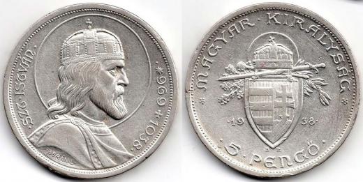 5 Pengö 1938 BP - svatý Štěpán, KM.516, dr.škr.
