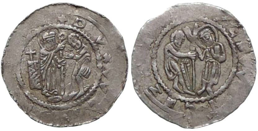 denár Cach 587, biskup se svatozáří, opisy část.ned. 0,895g