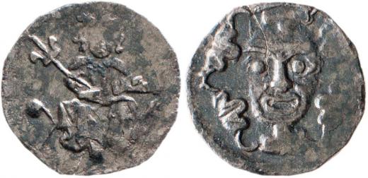 Uhry denár, sedící král čelně/hlava zepředu, Huszár 436, 0,409g R -1/1