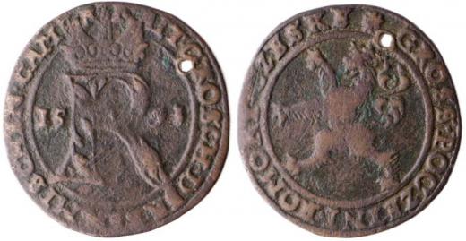 početní groš 1593 Kutná Hora-Herold, Mrštík 63a, dírka