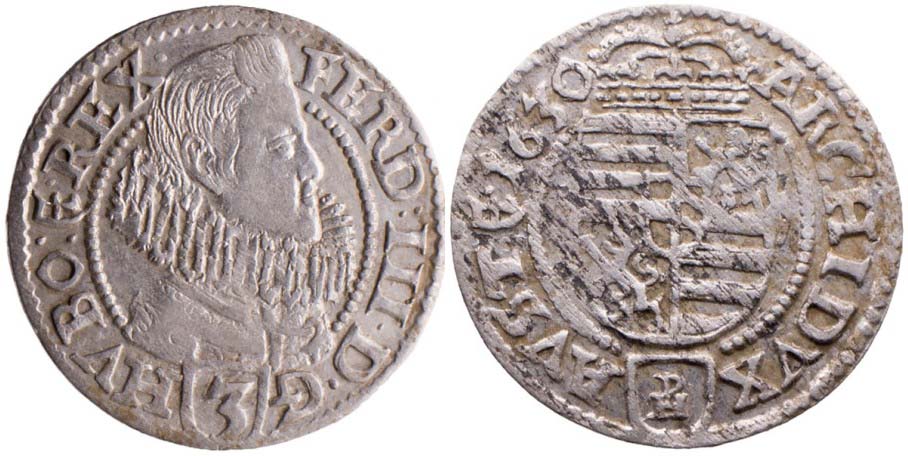 3 krejcar 1630 PH Kladsko-Hema, MKČ 1334var, závorka nominálu i zn.mincm. španělský štítek, dr.vady kovu v rev.