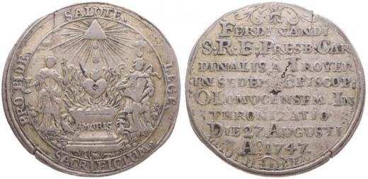 malá intronizační medaile 1747, SV str.292, starý podložní lístek, 4.22g, 27mm, dr.vad.mat., patina